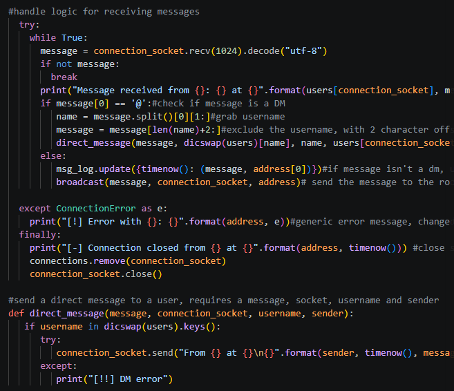 In this class we covered the fundamentals of networking using socket programming. We didn’t exactly have a final project for this class; instead we continually built out a sample chat app. We had minimal guidelines to follow for development and were just given a list of requirements that had to be met however we saw fit. I really liked this project, and ended up using it as an opportunity to make a terminal based chat room similar to Discord. I’ve attached an excerpt of my code as a screenshot below.